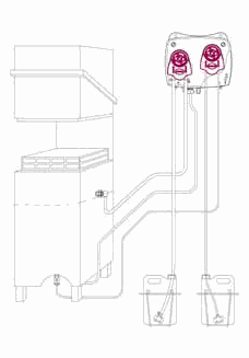 Un doseur installé. Ont voit bien les tuyaux qui viennent prendre le détergent et l'agent de rinçage, pour les envoyer directement dans la cuve.
